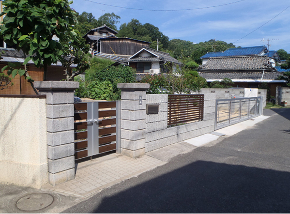 | 敷地の一体感を演出するために連続性のあるファサードをつくりました。 奥は跳ね上げ式の門扉です。 |